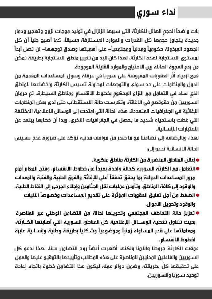 أكدت حركة البناء الوطني في هذا النداء على ضرورة الاستجابة الإنسانية المجردة لأهوال هذه الكارثة التي وحدت -ولأول مرة من /12/ سنة- السوريين بعيداً عن اصطفافاتهم السياسية.