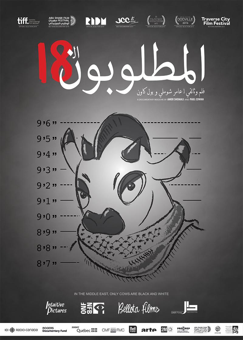 حيث عرض يوم السبت 2 تشرين الثاني، الفيلم الوثائقي الأول "المطلوبون الـ 18" للمخرجين "عامر شوملي - بول كاون" من إنتاج عام 2014، يتحدث عن جهود الفلسطينيين في بيت ساحور لبدء صناعة ألبان محلية الصنع خلال الانتفاضة الأولى، حيث أخفوا قطيعاً مكوناً من 18 بقرة من على مرأى قوات الأمن الإسرائيلية عندما اعتبرت مجموعة الألبان تشكل تهديد، يحوي الفيلم على مقابلات وثائقية مع المشاركين في الأحداث، لقطات أرشيفية، رسومات، ورسوم متحركة بالأبيض والأسود.