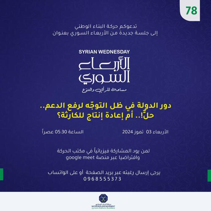 الجلسة 78 من جلسات "الأربعاء السوري" أقامتها حركة البناء الوطني بتاريخ 3 تموز 2024، وطرحت فيها قرار الحكومة الأخير بالتوجه نحو الدعم النقدي، وذلك بحضور عدد من الناشطين/ات، والمختصين/ات في قضايا الاقتصاد والشأن العام.