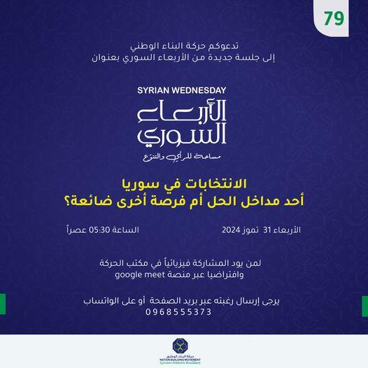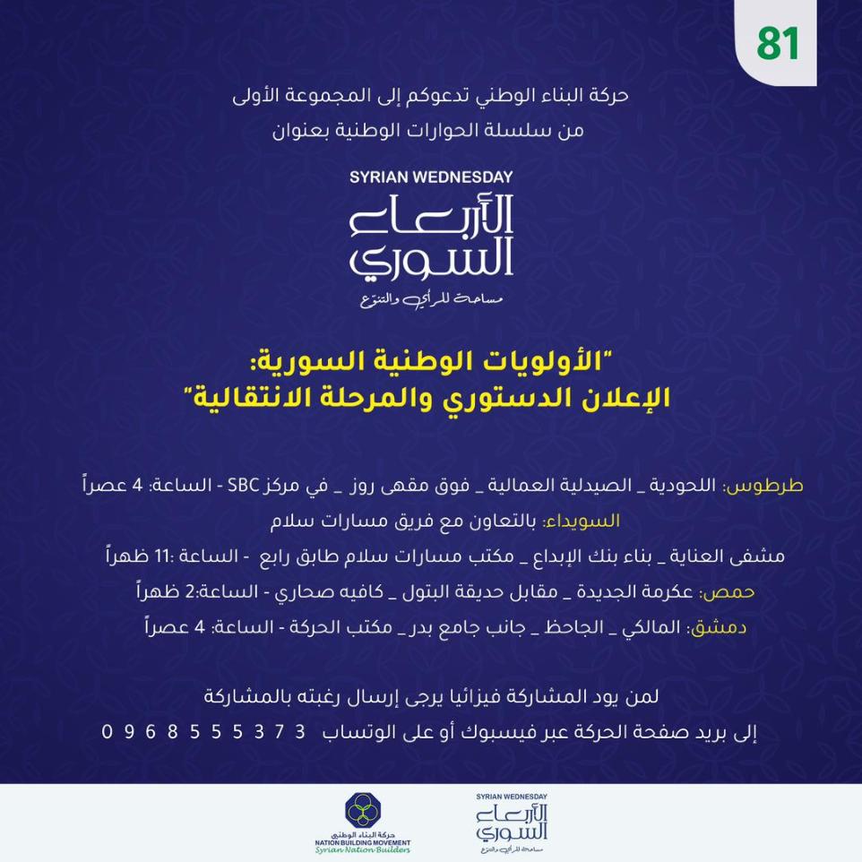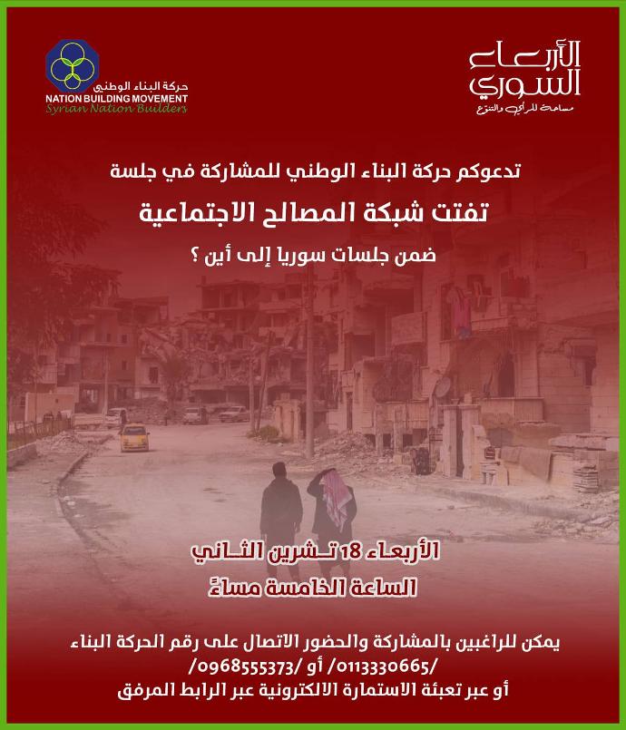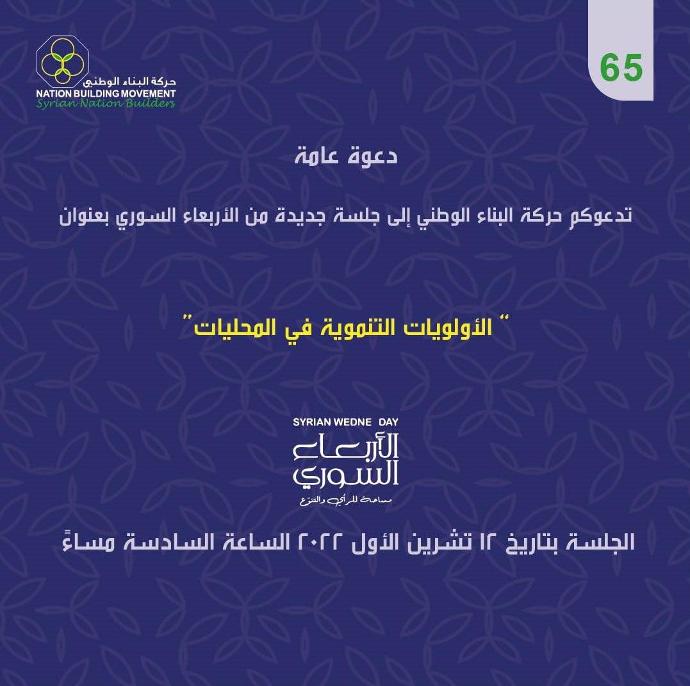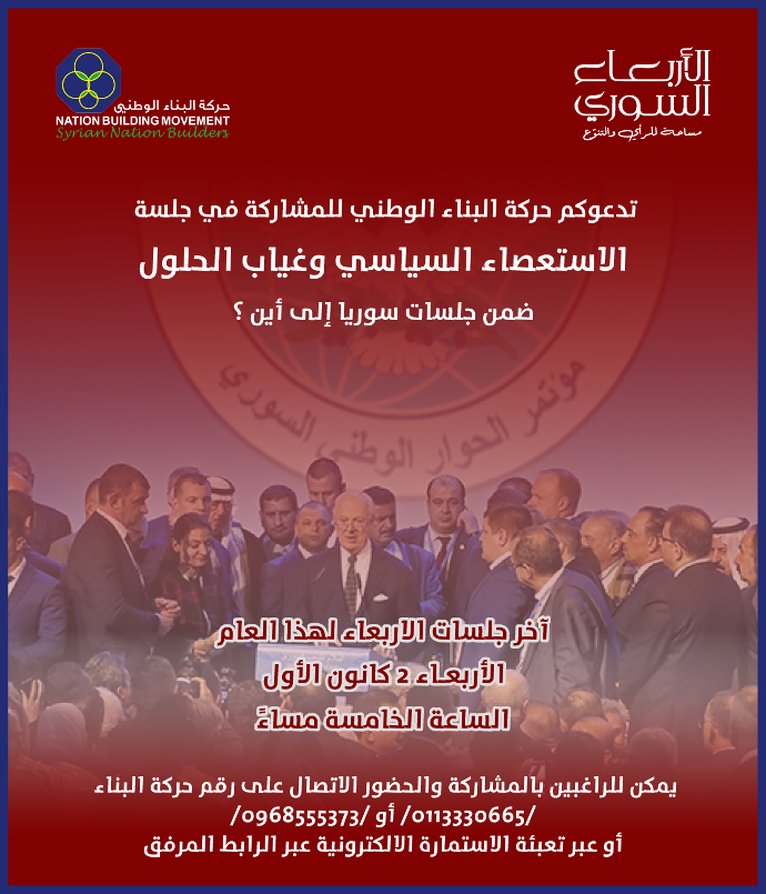 في جلستها الحوارية الأولى من سلسلة "سوريا.. أين؟!"، عقدت حركة البناء الوطني في مقرّها بدمشق الجلسة رقم 72 من برنامج الأربعاء السوري بعنوان: "سوريا.. أين؟! قراءة في المتغيرات السياسية"، بمشاركة مجموعةٌ من الناشطين والسياسين من الداخل والخارج السوري فيزيائياً وافتراضياً.