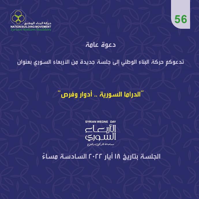 تجاوزت الجلسة السادسة والخمسين من جلسات الأربعاء السوري جدل الشارع حول الأعمال الدرامية التي عُرضت في موسم رمضان 2022 لتناقش دور الدراما والسينما في تناول قضايا المجتمع السوري. حيث عُقدت الجلسة بتاريخ 18 أيار 2022 وحملت عنوان "الدراما السورية.. أدوار وفرص" بحضور مجموعة من خبراء الدراما والنقاد والإعلاميين والناشطين
