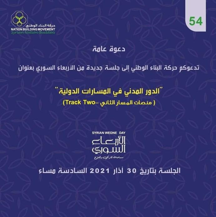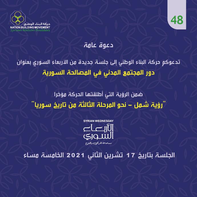 تعاود جلسات الأربعاء السوري في الجلسة التاسعة عشر من المشروع والأولى لهذا العام، حيث تقيم حركة البناء الوطني الأربعاء 22 كانون الثاني جلسة حوارية بعنوان: "دور المجتمع المدني في بناء سوريا"