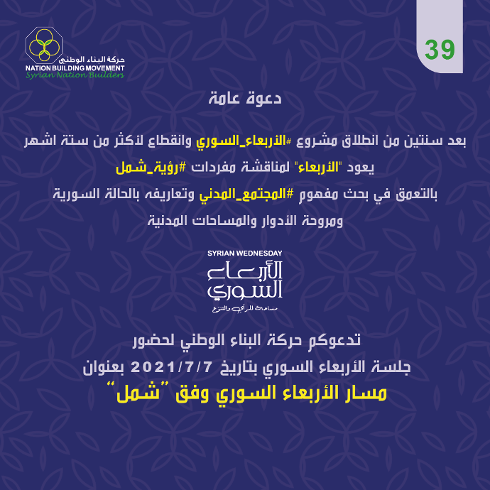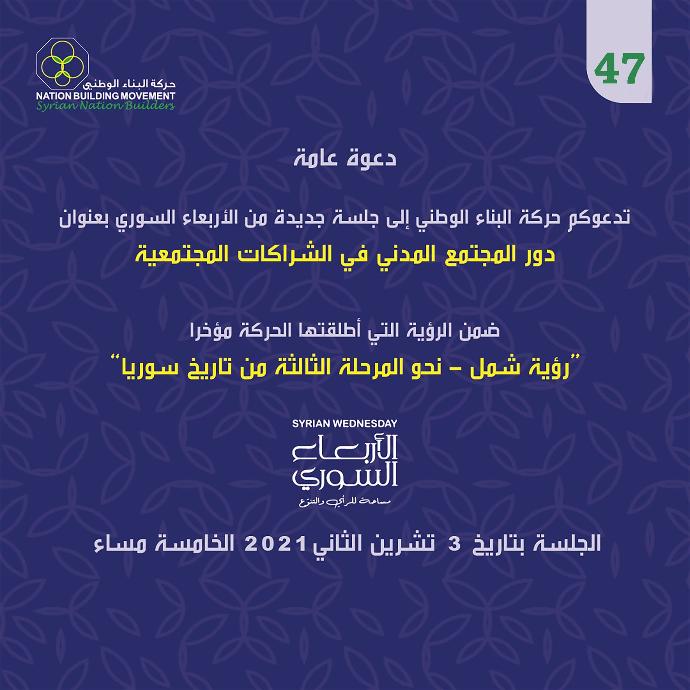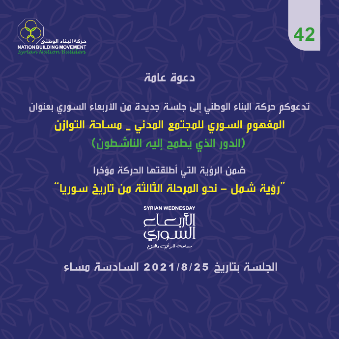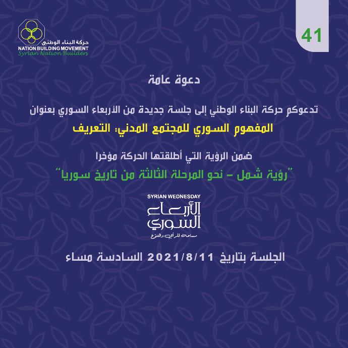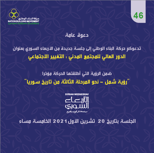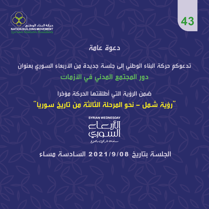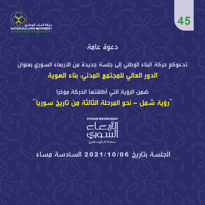 في إطار تفكيك رؤية شمل نحو المرحلة الثالثة من تاريخ سوريا انطلقت الجلسة الخامسة والأربعين من برنامج الأربعاء السوري بتاريخ 6 تشرين الأول 2021 والتي حملت عنوان "الدور العالي للمجتمع المدني بناء الهوية" بحضور مجموعة من الخبراء والناشطين المدنيين في مكتب حركة البناء الوطني بدمشق وافتراضياً عبر منصة زووم الالكترونية.