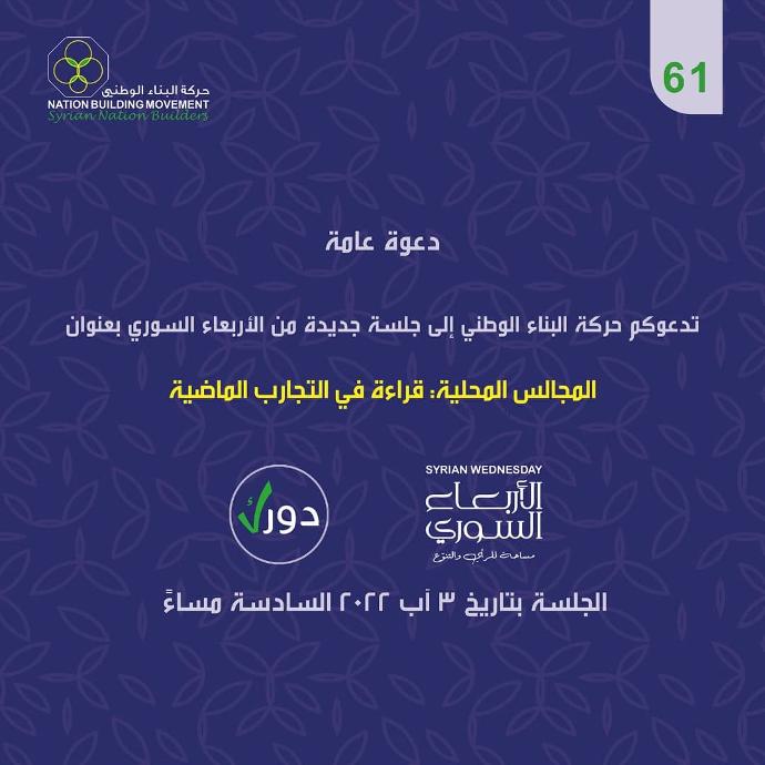 عقدت حركة البناء الوطني الأربعاء 2/ 3/ 2022 الجلسة الثانية والخمسين من برنامج "الأربعاء السوري" التي حملت عنوان "المسؤولية المدنية في سوريا"، بمشاركة مجموعة من الفاعلين والناشطين المدنيين.