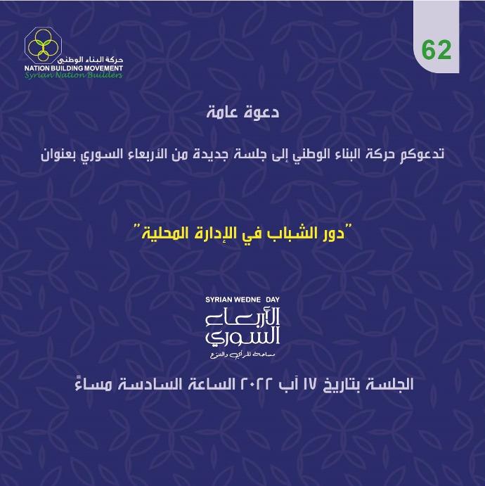 واصلت حركة البناء الوطني سلسلة جلسات الأربعاء السوري لعام 2022، حيث بدأت السلسلة الجديدة بعقد الجلسة (51) في مقر الحركة بدمشق بتاريخ 16 شباط 2022 ، وذلك بحضور عددٍ من الناشطين والمهتمين بالشأن العام، وافتراضياً عبر منصة (Google meet) الالكترونية، تحت عنوان " قراءة في المتغيرات الدولية و الإقليمية وأثرها على الواقع السوري"