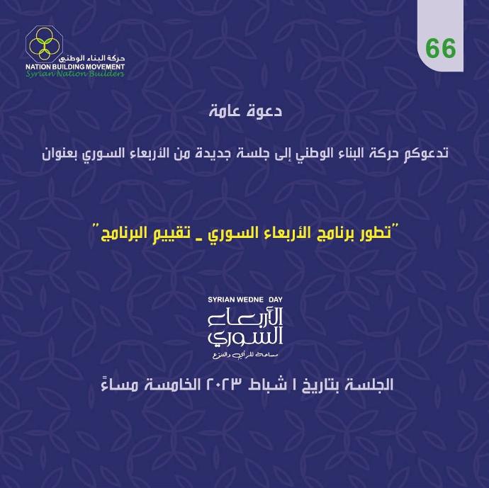أطلقت حركة البناء الوطني الجلسة الأولى من جلسات الأربعاء السوري لعام 2023؛ بجلسة تقييم ومراجعة حملت عنوان "تطور مسار برنامج الأربعاء السوري _ تقييم البرنامج" وذلك في مقر الحركة بدمشق بتاريخ 1 شباط 2023 و بحضور مجموعة من الناشطين والمهتمين بالشأن العام.
